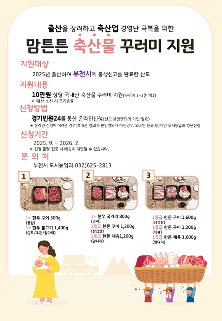 지원 대상은 2025년 1월 1일 이후 출산하고 부천시에 출생신고를 완료한 산모 2,384명으로, 1인당 10만 원 상당의 한우 또는 한돈 축산물 꾸러미를 제공한다.
