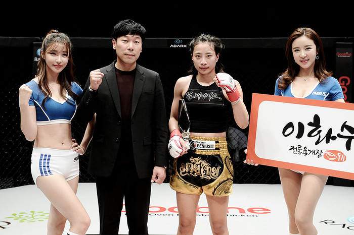 멋진 경기를 보여준 선수들을 위해 스폰서들은 직접 시상자로 나섰다. ㈜라온건설 정일 대표, 이화수 전통 육개장 정은수 대표, 바인그룹 김광섭 상무, 아닥스 거래소 이기범 대표, 굽네몰 김영철 대표가 케이지에 올라 선수들에게 트로피를 전달하며 승리를 축하했다.