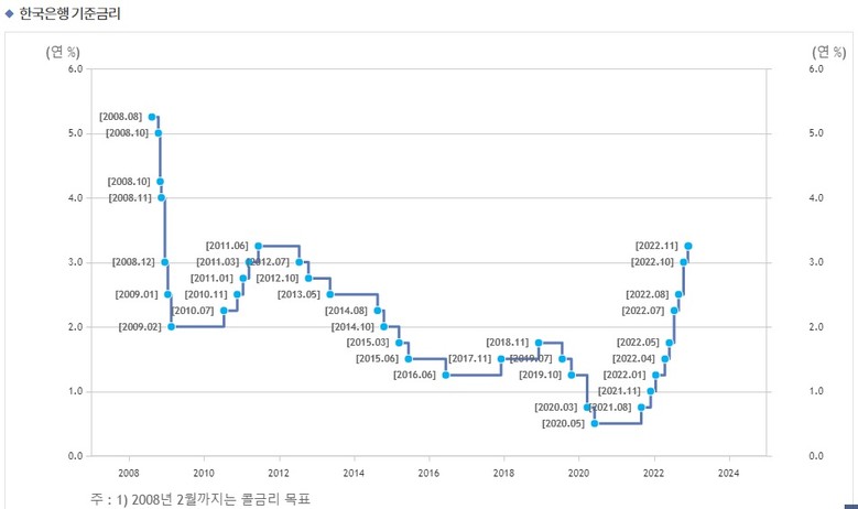 실제 최근 1년간 한국은행의 기준금리는 2021년 12월 1%, 2022년 3월 1.25%, 2022년 5월 1.75%, 2022년 8월, 2.50%, 2022년 10월 3%, 11월 3.25%로 지난 1년간 가파르게 상승했다.