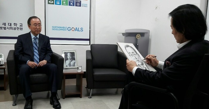 [사진 설명] 반기문 전 유엔총장 스케치하는 신현호 화백.