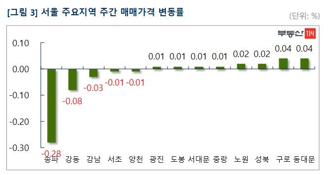 부동산114(www.r114.com)에 따르면 11월 마지막 주 서울 아파트 매매가격은 0.04%(재건축 -0.08%, 일반 -0.03%) 떨어지며 지난주의 -0.03% 대비 하락폭이 커졌다. 송파구와 강동구 일대에 위치한 재건축아파트 중심으로 수요가 위축되고 거래가 끊기면서 하락폭이 확대되는 양상이다. 다만 신도시(0.00%)와 경기·인천(0.00%) 지역은 전주와 마찬가지로 보합 수준에서 움직임은 크지 않았다.