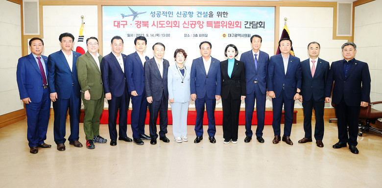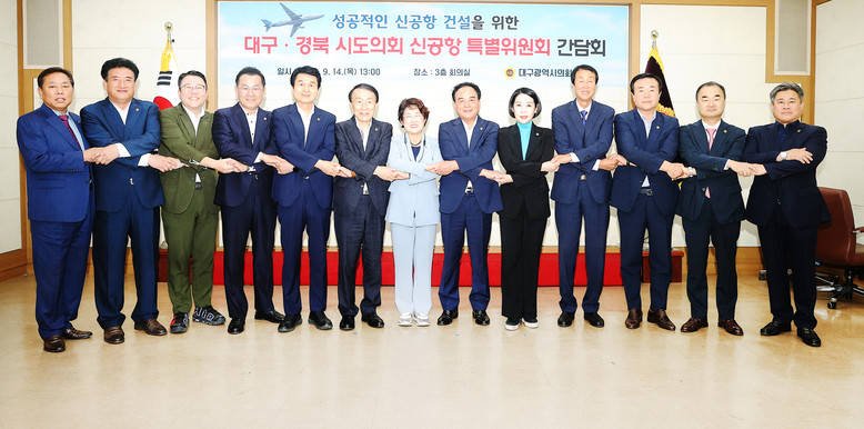 [대구 세계타임즈=한성국 기자] 대구시의회 통합신공항 건설 특별위원회(이하 ‘신공항특위’)는 9월 14일(목) 오후 1시 대구시의회 3층 회의실에서 경상북도의회 신공항 이전지원 특별위원회와 ’성공적인 신공항 건설을 위한 대구·경북 시도의회 신공항특별위원회 간담회‘를 개최했다.