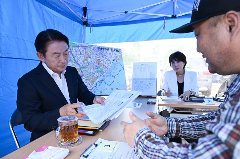 송산2동 주민센터 앞 야외 주차장에서 진행된 현장시장실에는 10여 명의 시민들이 참석했다. 상담에 앞서 김동근 의정부시장은 현장시장실에 찾아온 시민들에게 송산2동의 주요 현황에 대해 설명한 후 시민들과 1:1 상담을 진행했다.