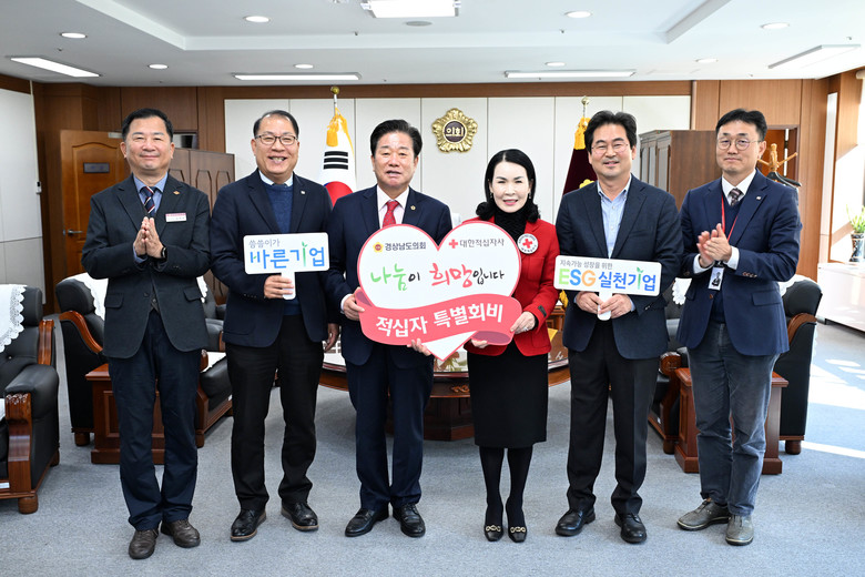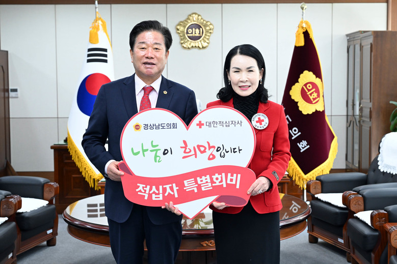 [경남 세계타임즈=최성룡 기자] 김진부 경상남도의회 의장은 21일 경상남도의회에서 2024년 대한적십자사 특별회비 전달식을 갖고 대한적십자사 경남지사(회장 박희순)에 특별회비 1백만원을 전달했다.