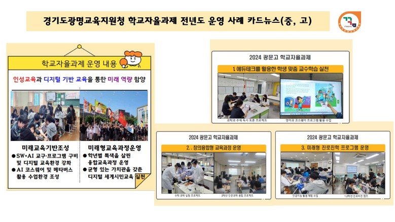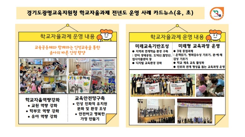 광명 내 학교자율과제 운영 사례를 학교급별로 살펴보면, ▲ 교원과 학부모가 협력하여 유아의 바른 인성을 함양하는 교육안전망 구축(밝은빛유치원) ▲ 지역사회 교육자원 활용, 학교체육 활성화 등을 추진하는 미래형 교육과정(하안북초) ▲균형 있는 가치관을 기르는 인성교육과 디지털 기반 교육을 통한 미래 역량 함양(소하중) ▲ 에듀테크를 활용한 학생 맞춤형 학습, 창의융합 교육과정, 미래형 진로진학 프로그램(광문고) 등이 있다.