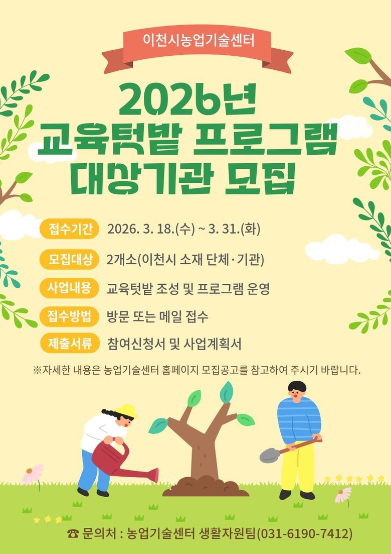 모집 대상은 이천시에 주소지를 둔 기관 및 단체로 서류 심사, 현지 실태 조사, 그리고 도시농업위원회의 심의를 거쳐 최종 2개소를 선정할 예정이다.