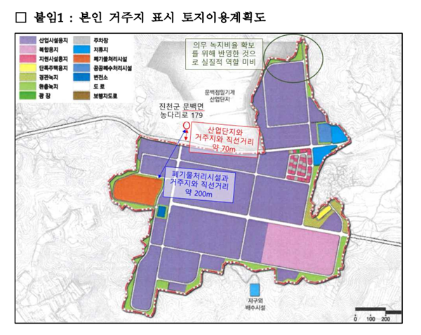 이 말을 들은 K 씨는 폐기물 매립지를 산업단지 내에서 조금만 옮겨서 부모님이 살고 계신곳과 약 800m 정도만 떨어져서 라도 시설을 하면 어떻겠냐고 요청을 하였으나 이 마저도 충청북도와 진천군은 받아들여 주지 않고 이미 각 기관에서 사업승인 협의가 끝난 상태이며 특히 금강 환경청 승인이 났다는 이유로 폐기물매립지를 조금도 옮길 수 없다고 답변했다.