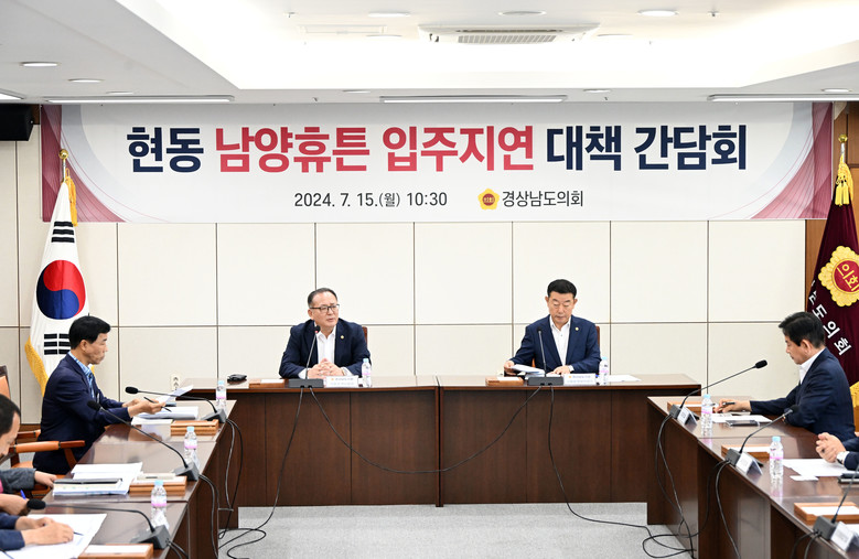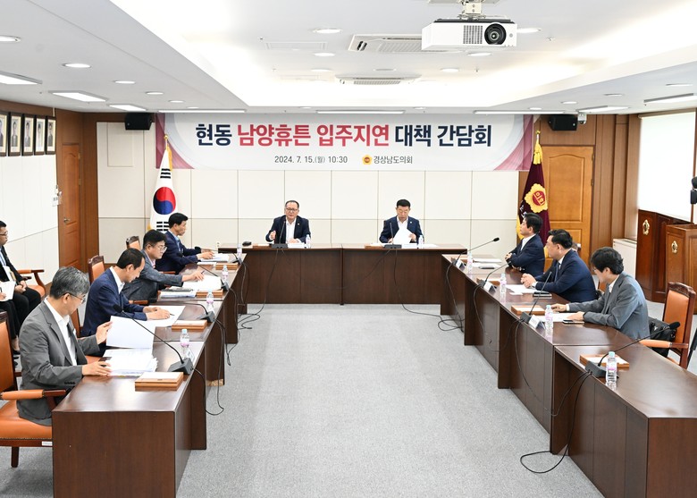 [경남 세계타임즈=최성룡 기자] 15일 경상남도의회 의정회의실에서 세 차례 입주가 지연되면서 논란을 빚고 있는 현동남양휴튼 사태해결 방안 모색을 위해 간담회가 개최되었다.