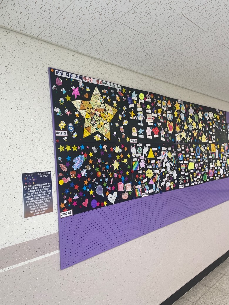- 1,2학년은 ‘세모별 디디’ 동화책을 함께 읽고, 협동화 만들기를 통해 다름을 주제로 표현했고,