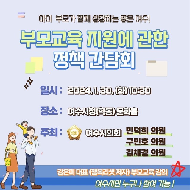 [여수시 세계타임즈=우덕현 기자] 여수시의회(의장 김영규)는 오는 30일 화요일 오전 10시 30분 여수시청 문화홀에서 민덕희 구민호 김채경 의원 공동주최로 ‘아이와 부모가 함께 성장하는 여수’를 만들기 위한 ‘부모교육지원 정책간담회’를 개최한다고 밝혔다.