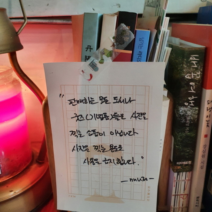 그런데 찾는 손님이 늘었음에도, 서점을 운영하는 주인의 시름은 자꾸만 늘어가고 있다. 이유는 대부분의 관광객들이 책을 읽고 구매하기보다, 책과 함께 ‘인생샷’만 남기고 소리 없이 사라져버리기 때문이다. 서점 곳곳에는 “새한서점의 책들은 소품이 아니라 읽는 책들입니다. 사진만 찍는 소품으로 사용하지 말아주세요”라는 내용의 쪽지가 붙어 있었다. 그리고 눈에 들어 온 한 문장.