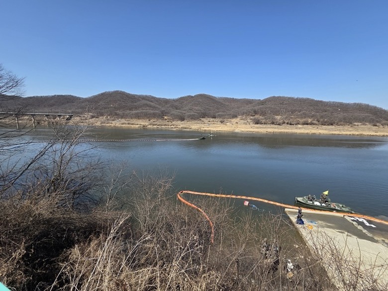 훈련은 적 공격으로 유류저장시설이 파손돼 임진강으로 약 4,000리터의 경유가 유출된 상황을 가정해 진행됐다. 현장에서는 상황 전파와 방제 지원 요청을 시작으로 오염 확산 차단, 유류 회수, 잔존 오염물 제거, 환경정화 작업 등 실제 방제 절차 전반에 대한 대응훈련이 이뤄졌다.