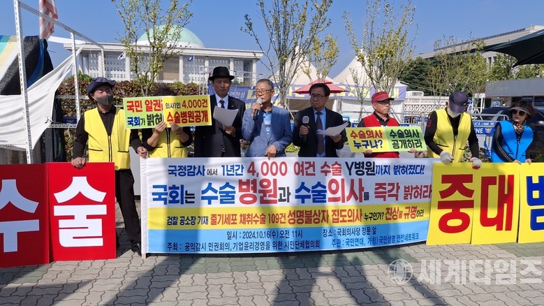 [세계타임즈 = 이진화 기자] 지난 16일 오전 국회 정문 우측 근처에서 열린 공익감시 민권회의(의장 송운학), 국민연대(대표 이근철), 기업윤리경영을 위한 시민사회단체(공동의장 이보영), 가칭)국민생명 안전네트워크(준) 등 시민단체들이 대리수술, 유령수술에 관한 제5차 공익 기자회견을 개최하면서 “대리수술, 유령수술실태 전수조사 실시하고 결과를 모두 공개하라!”고 촉구했다.