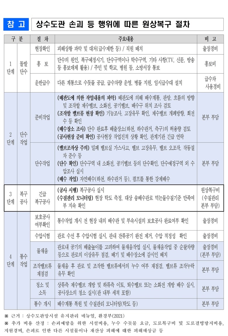 또한, “이번 개정안은 상수도사업본부가 부담하고 있던 급수정상화를 위한 간접 유지관리비용도 원인자가 부담하도록 원인자부담금 산출방식을 합리화하기 위한 것”이라고 강조했다.