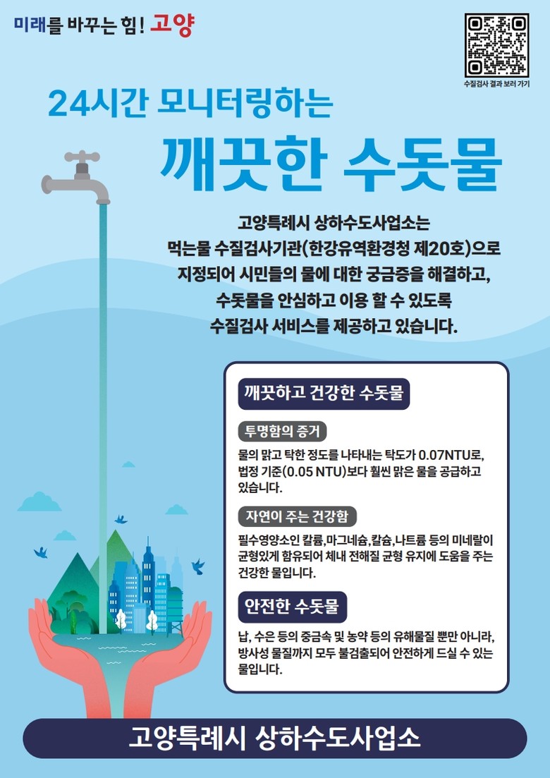 상하수도사업소 관계자는 "이번 캠페인을 통해 고양시 수돗물에 대한 궁금증이 해소되고 시민들의 신뢰도가 크게 향상되길 바란다”며 "앞으로도 다양한 현장 홍보활동을 통해 안전하고 깨끗한 수돗물 음용 문화 정착에 최선을 다하겠다”고 말했다.
