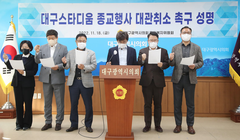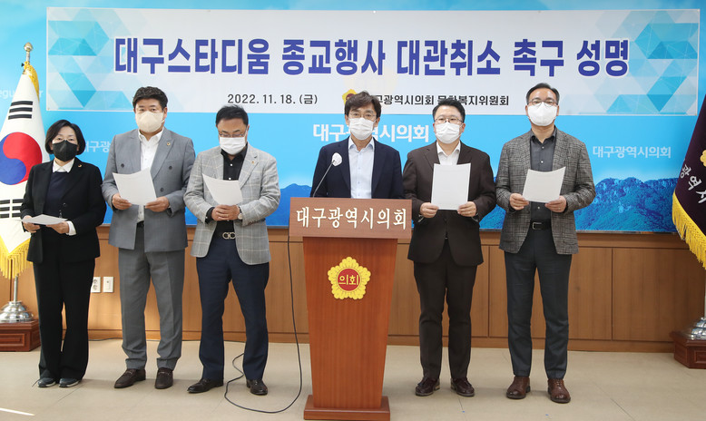 [대구 세계타임즈=한성국 기자] 대구광역시의회 문화복지위원회(위원장 김재우)는 오는 11월 20일(일) 대구스타디움에서 예정된 특정종교단체 주관의 종교행사에 대하여 대관 취소를 촉구하는 성명서를 11월 18일(금) 대구시의회에서 발표했다.