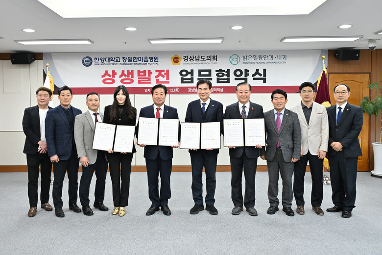이날 협약식에는 김진부 도의회 의장과 하충식 창원한마음병원 이사장, 밝은힐링안과내과 반소연 총괄이사 등 관계자가 참석한 가운데 진행되었으며, 앞으로 세 기관은 협약서를 바탕으로 상생발전을 위한 노력을 함께 해나갈 계획이다.