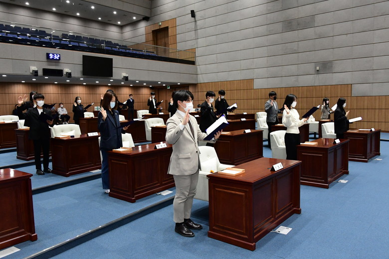 모의의회 정동환 의장은 “시민의 권익증진과 지역사회 발전을 위하여 모의의회 활동을 성실히 수행하겠다”라고 힘찬 포부를 밝히며 엄숙히 선서했다.