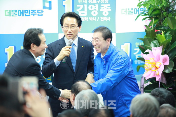 정세균 국회의장과 박원순 서울시장 예비후보하고 악수하고 있다.사진=이연종 기자