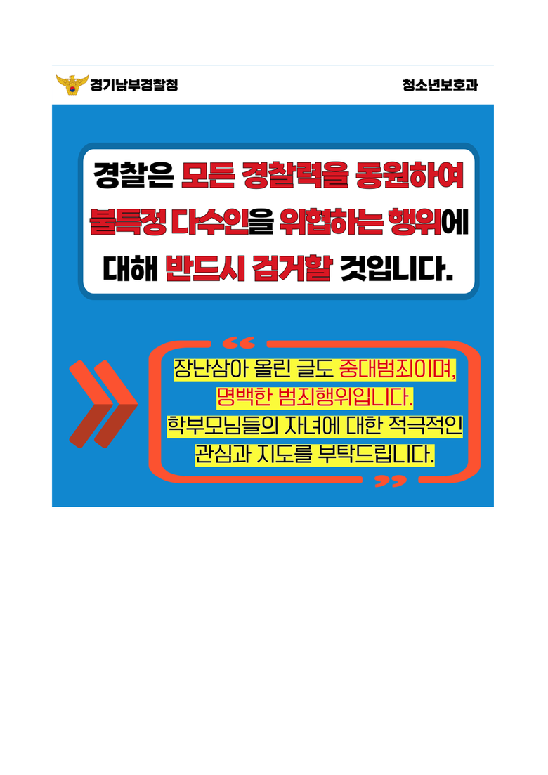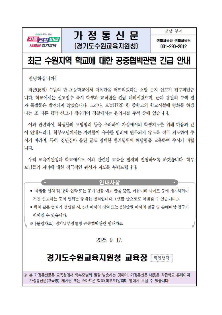 특히 이번과 같은 폭발물 설치, 방화 협박 예고 글을 SNS나 커뮤니티 사이트 등에 게시하거나 거짓 신고하는 행위는 호기심, 장난 등 어떠한 이유를 불문하고 중대한 범죄임을 강조하며, 교육지원청과 각 학교에서도 이와 관련된 교육을 철저히 할 예정임을 안내했다.