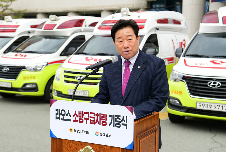 [경남 세계타임즈=최성룡 기자] 경남도의회(의장 김진부)가 지난 23일, 라오스*에 소방 특수구급차량 12대와 특수방화복 60착 등 소방용품을 기증한다고 밝혔다. 이 중 경남도의회와 우호교류협약 단체인 비엔티엔주에 10대, 인근 보께오주에 2대를 보내게 된다.