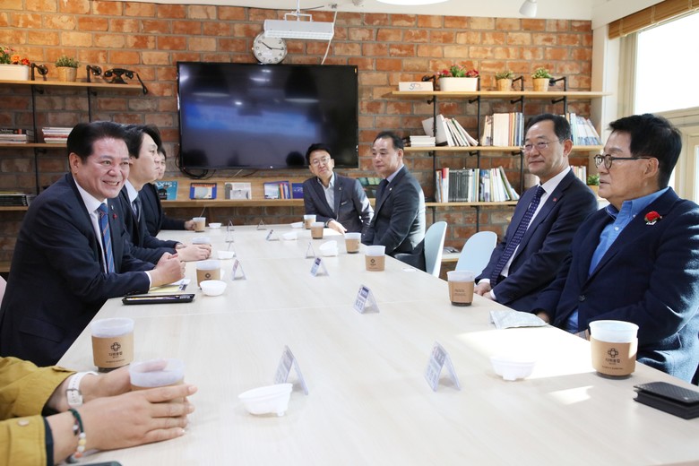 | ▲ 최대호 안양시장(왼쪽 첫번째)과 명현관 해남군수(오른쪽 두번째) 박지원 의원(오른쪽 첫번째)이 14일 안양시청 3층 접견실에서 이야기를 나누고 있다 |