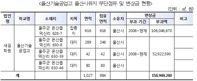 학교법인 새길학원에서 설치・경영중인 울산기술공업고의 울산시 소유 토지 무단점유는 금년도 학교법인 재산조사에서 새롭게 확인된 사항으로 무단 점유토지 및 변상금 부과 현황은 다음과 같습니다.