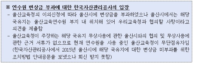 해당 국유지는 연수원 담장 경계 대왕암 공원(수목 조성) 일부 및 테니스장 부지로 울산교육연수원에서 사용하지 않는 부지이나 연수원 담장 내 위치해 있어 우리교육청에 변상금을 부과한 것으로,