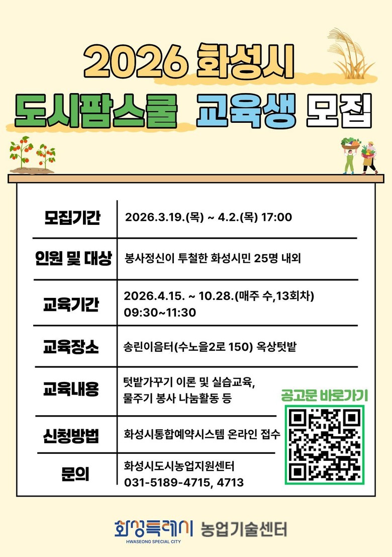 모집 대상은 화성시민으로 도시농업에 관심 있는 시민이면 누구나 신청할 수 있으며, 화성시 통합예약시스템을 통해 접수하면 된다.
