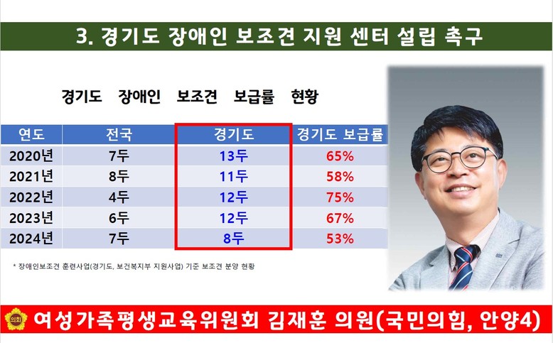 김재훈 의원은 “경기도는 그동안 장애인 보조견 지원사업을 선도적으로 추진해 왔으나, 지난해 훈련기관의 보조금 부정수급이 적발되면서 사업이 중단된 상태”라며 “장애를 가진 도민의 자립과 이동권을 보장하기 위해 보조견은 필수적임에도 현재 이를 담당할 곳이 없는 실정”이라고 지적했다.