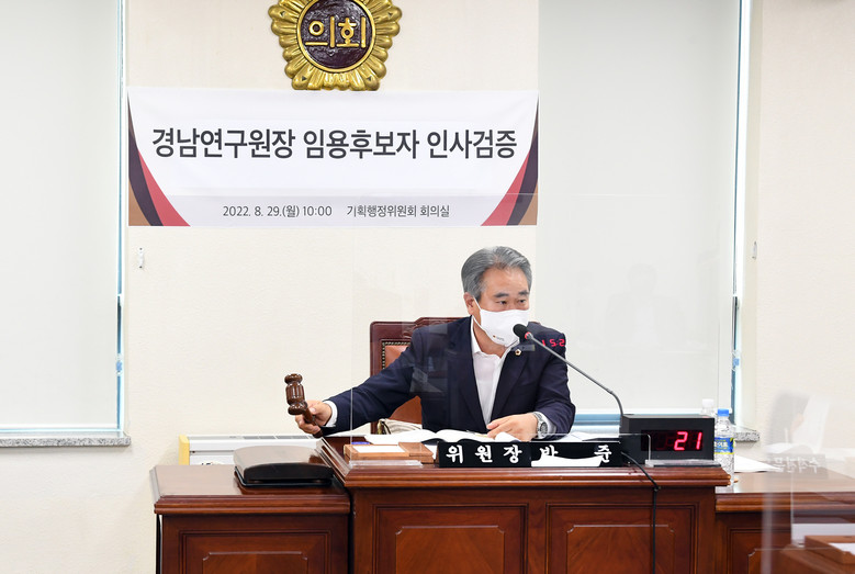 [경남 세계타임즈=최성룡 기자] 경상남도의회 기획행정위원회(위원장 박준)는 29일 기획행정위원회 회의실에서 송부용 경남연구원장 임용후보자 인사검증을 위한 회의를 개최하였다.