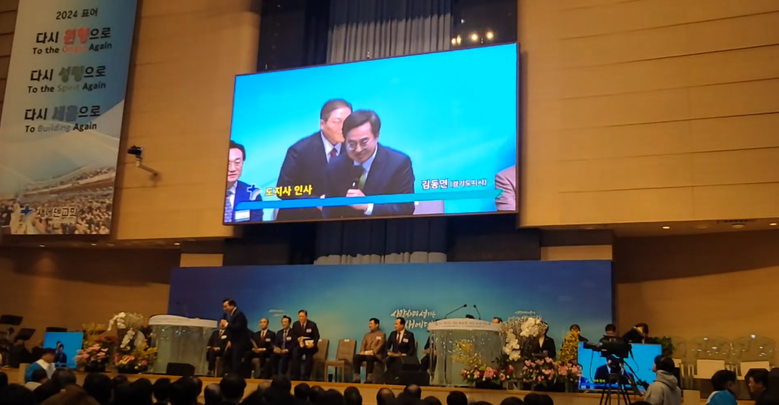 | ▲지난 1월 25일 경기도기독교총연합회가 새에덴교회에서 신년 기도회를 연 가운데 김동연 경기도지사가 인사말을 전하고 있다. (사진 = 새에덴교회 유튜브 갈무리) |