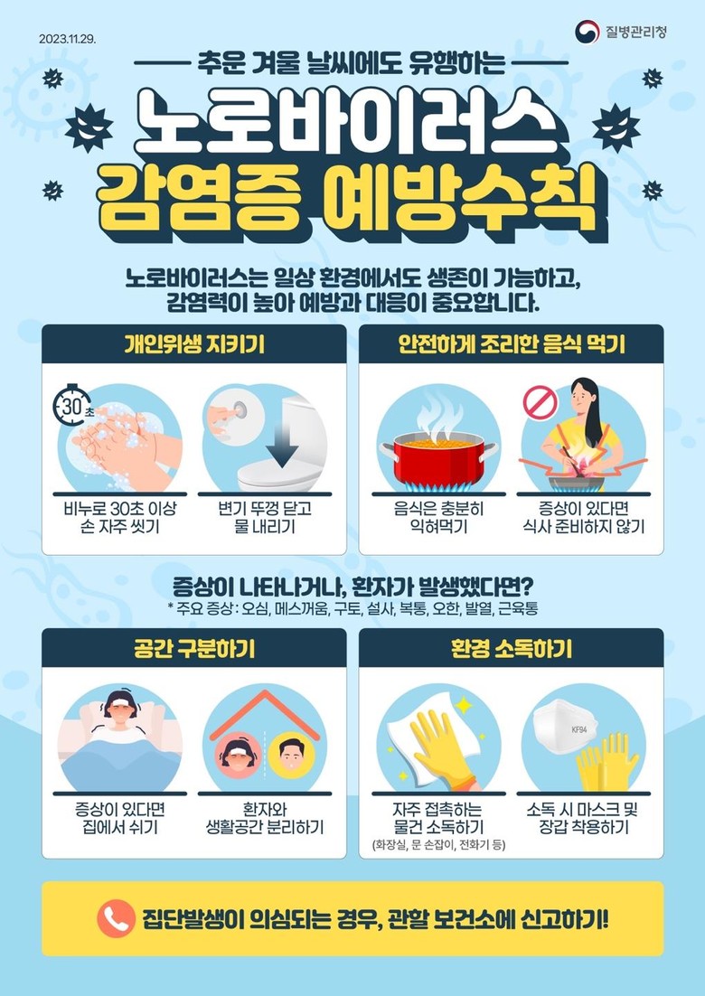 한편, 설사나 구토 등 노로바이러스 의심 증상이 나타날 경우 즉시 의료기관을 방문해야 하며, 2명 이상 집단 설사 환자가 발생한 경우에는 신속히 양평군보건소 보건정책과(☎031-770-3490)로 신고 및 문의하면 된다.