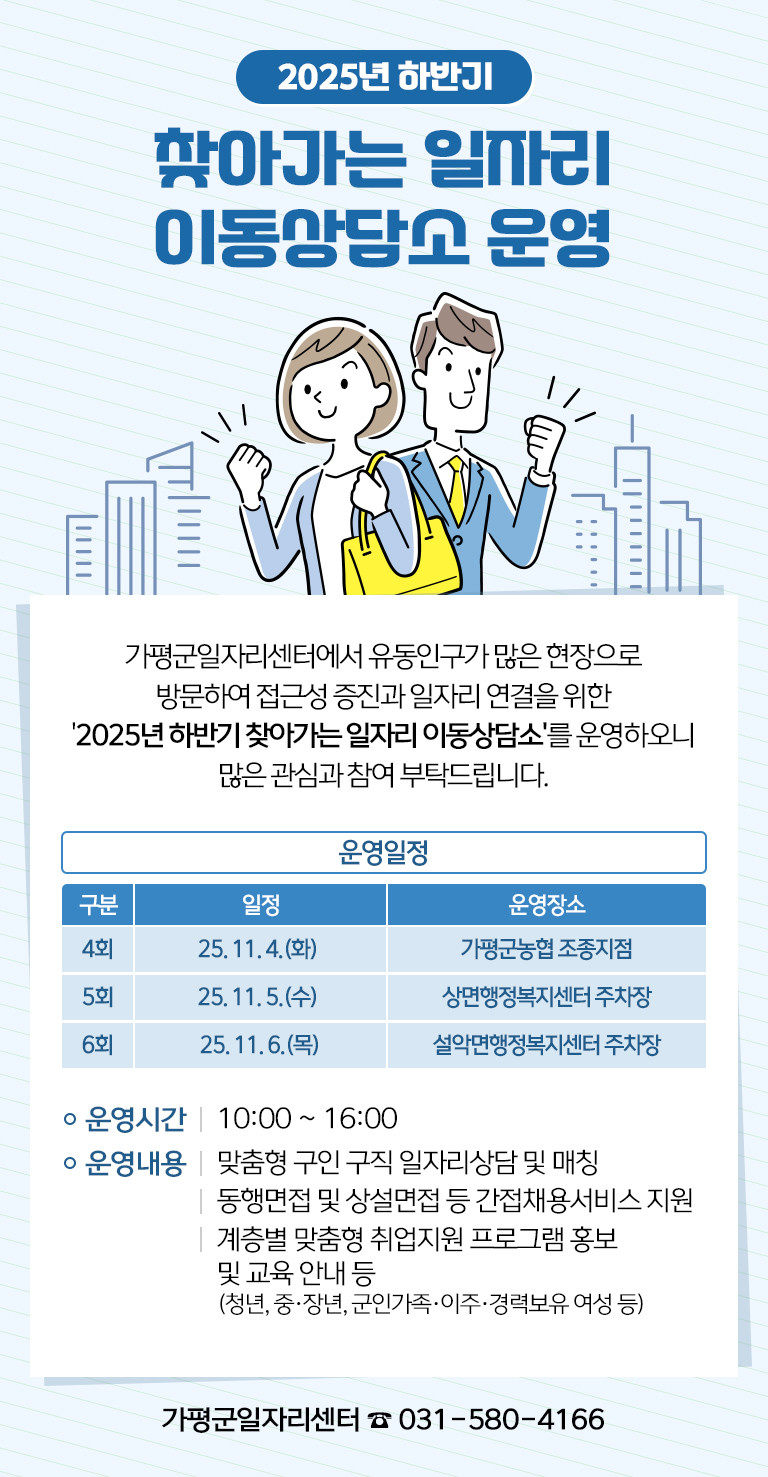 자세한 문의는 가평군일자리센터(☎031-580-4166)로 하면 된다.