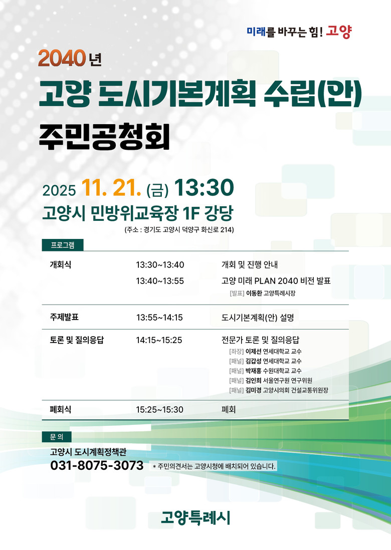이번 주민 공청회에서는 이동환 고양특례시장이 2040년 고양 도시기본계획 수립(안)의 근간이 되는 ‘고양 미래 PLAN 2040’을 발표해 자족도시로 나아가야 할 고양특례시의 미래 비전을 제시할 계획이다.