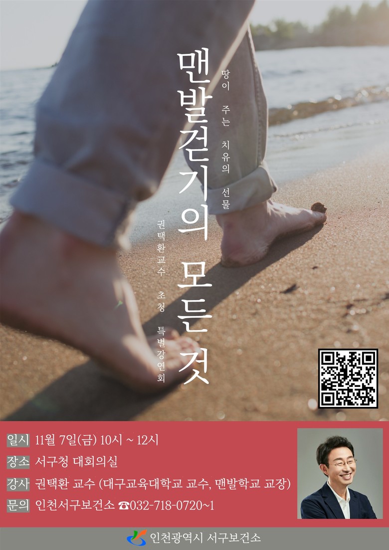 맨발걷기에 대한 정확한 정보를 제공하고자 마련된 이 강연회는 ▲개회식 ▲내빈 축사 ▲제1회 서구걷기왕선발전 시상 ▲강연 순으로 진행되며, 강연내용은 ▲맨발걷기란 ▲맨발걷기가 건강에 미치는 영향 ▲맨발걷기 효능 등으로 이루어진다.