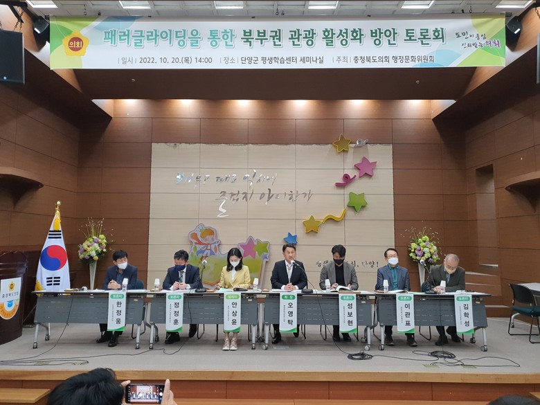 [충북 세계타임즈=이현진 기자] 충북도의회 행정문화위원회(위원장 노금식)는 제404회 임시회 기간 중인 10월 20일(목), 단양군 평생학습센터 세미나실에서 ‘패러글라이딩을 통한 북부권 관광 활성화 방안 토론회’를 개최하여 도민과 전문가의 의견을 수렴하는 시간을 가졌다.