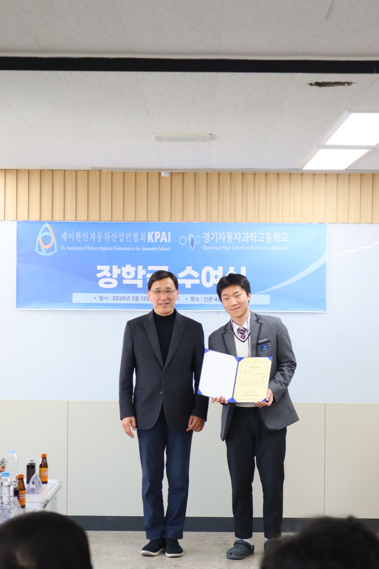 KPAI 협회는 3월 12일(목) 오후 1시, 경기자동차과학고등학교에서‘2026년도 장학증서 수여식’을 개최하고, 선발된 20명의 장학생에게 증서를 전달했다. 이날 행사에는 KPAI 협회 박정국 (전)회장(현대자동차 전 연구개발본부장), 김용화 회장(현대자동차 전 연구개발본부장), 임한규 대표이사(포리코리아), 김철우 대표이사(위첸만 코리아), 김스티븐 전무(LG화학 ABS 사업부장) 등 자동차 산업을 이끄는 주요 인사들이 대거 참석해 미래의 후배들을 격려했다.