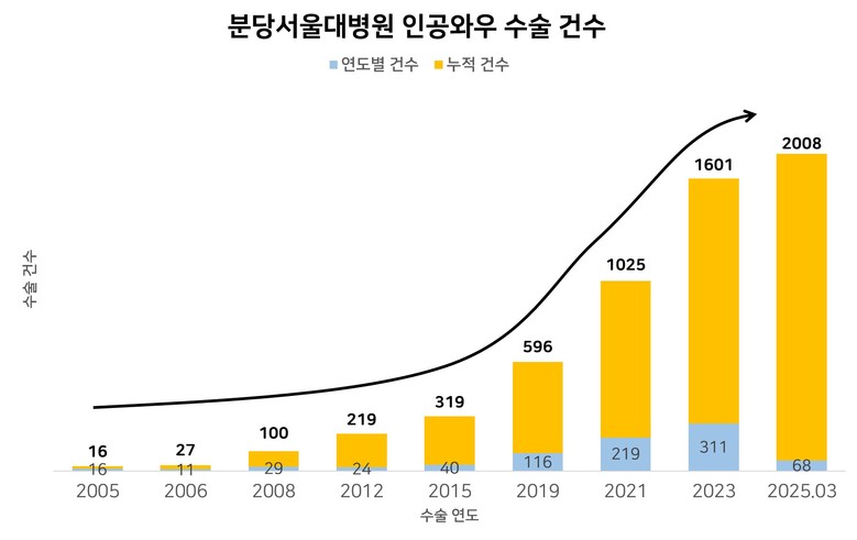 2005년 인공와우 수술을 시작한 분당서울대병원 청각재활센터는 2019년 누적 500례 달성 이후, 2021년 1,000례, 2023년 1,500례 수술 시행을 거쳐 마침내 올해 3월 ‘2,000례 돌파’라는 기록을 달성했다. 이렇듯 2년 마다 약 500건 이상의 수술을 집도하면서 단기간에 매우 빠른 성장세를 보여 왔다.
