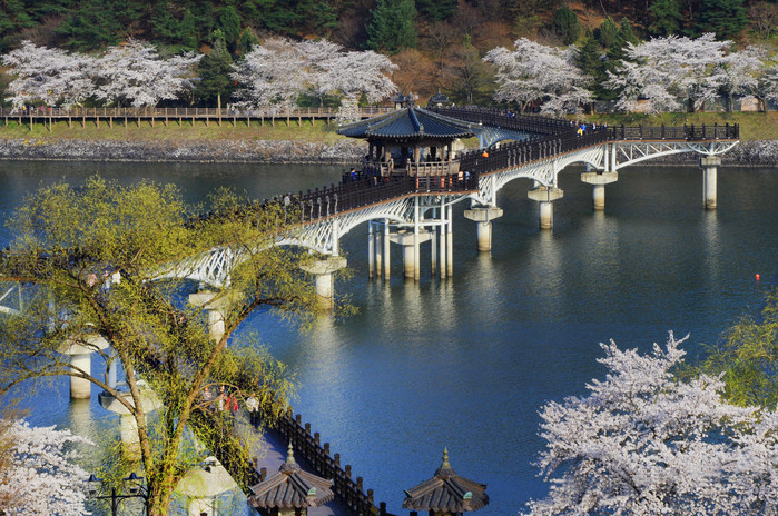 ▲ 김천에는 교동 연화지 둘레길이 SNS 입소문을 통해 널리 알려져 있다. 김천시에 따르면 연화지 벚꽃은 하늘에서 내려다 본 가장 아름다운 벚꽃이라고 한다.