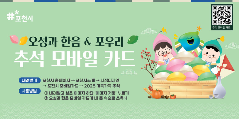 ‘2025 가득가득 추석 모바일 카드’는 총 4종으로 제작했으며, 포천시청 누리집 내 ‘포천시소개 → 시정디자인 → 포천시 모바일카드 → 2025 가득가득 추석’ 메뉴에서 누구나 무료로 내려받아 자유롭게 활용할 수 있다.
