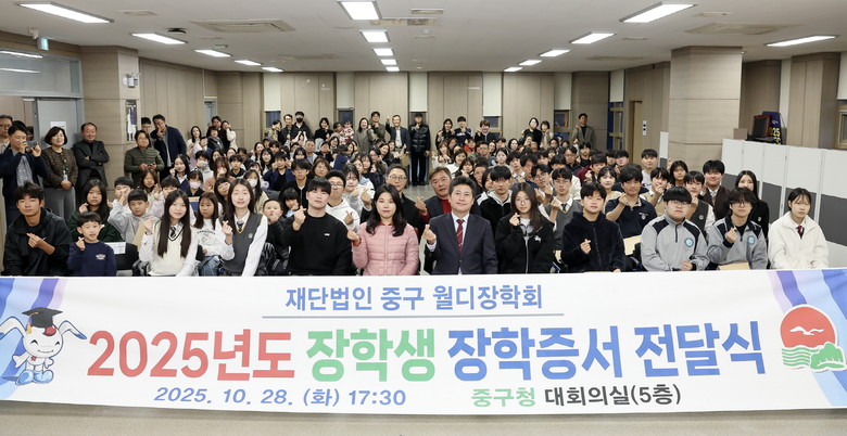 [중구 세계타임즈=심하린 기자] 재단법인 인천 중구 월디장학회(이사장 김정헌 중구청장)는 지난 28~29일 양일간 각각 중구 제2청과 제1청에서 ‘2025년도 장학증서 전달식’을 열고, 총 273명의 학생에게 5억 2,300만 원의 장학금을 지급했다.