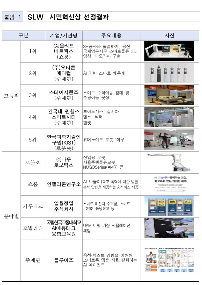 수상 기업에게는 차년도 SLW ‘시민혁신상 존’에서 전시 기회가 주어진다. 이를 통해 우수 기업이 지속적으로 시민과 만나고, 혁신 기술을 확산·사업화할 수 있는 발판을 마련한다는 점에서 의미가 크다.