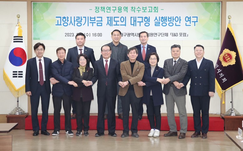 [대구 세계타임즈=한성국 기자] 대구시의회 의원연구단체 ‘E&D포럼’(대표 조경구 의원)은 2월 8일(수) 오후 4시 시의회 3층 회의실에서 소속 의원(대표 조경구, 간사 정일균, 이성오, 임인환, 김태우, 윤권근, 윤영애, 김지만, 이재화, 김원규, 이동욱, 전경원, 육정미)이 참석한 가운데 ‘대구형 고향사랑기부금 제도’ 정책연구용역 착수보고회를 개최했다.