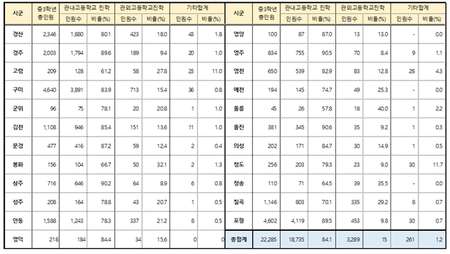 2023학년도 도내 중3 학생은 22,285명으로 중학교가 위치한 시군의 고등학교로 진학하는 학생은 18,735명, 다른 지역으로 진학하는 경우는 3,289명으로 나타났다. 다른 지역으로 진학한 3,289명 중 91%인 2,995명은 경북 도내에서 시군 간 이동이 있었으며, 다른 광역 시도로 진학한 학생은 294명(8.3%)인 것으로 나타났다. 2023학년도에만 10개 정도의 학반이 타 시도 고등학교로 진학한 것으로 볼 수 있다.