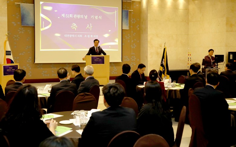 [대전 세계타임즈=이채봉 기자] 대전시의회 조원휘 의장은 31일 선샤인호텔에서 개최된‘제51회 관광의 날 행사’에 참석해 “국토의 중심지로 많은 관광 자원을 가진 대전의 관광산업 진흥을 위해 대전시의회가 앞장서겠다”고 밝혔다. 이날 조원휘 의장은 관광진흥유공 표창 수상자들을 축하하고 지역 관광산업 발전을 위한 관계자들의 노고에 감사를 전했다.