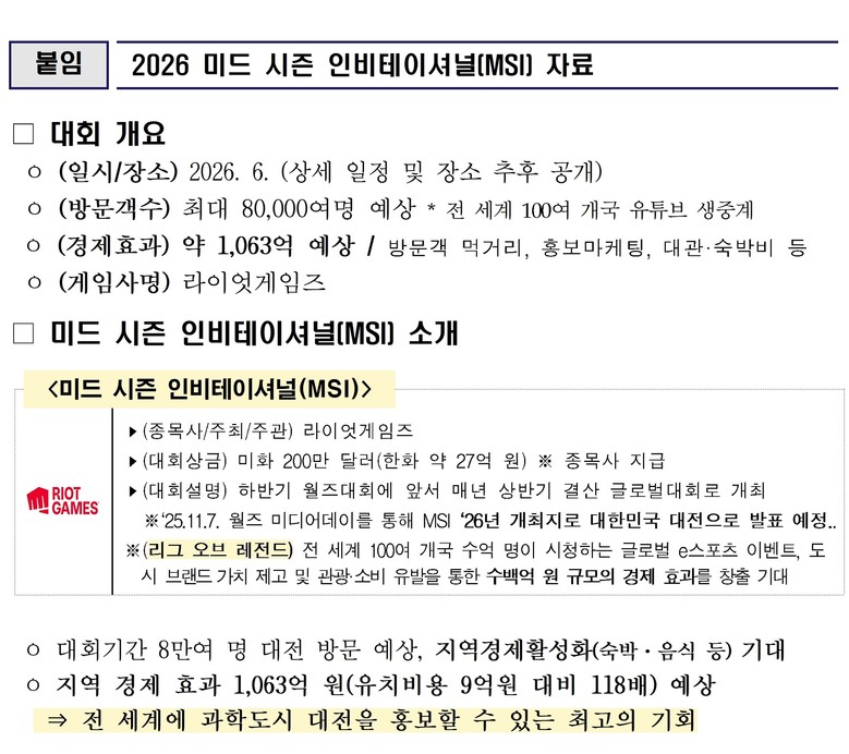 라이엇 게임즈는 7일 2025 리그 오브 레전드 월드 챔피언십 미디어 데이에서‘2026 미드 시즌 인비테이셔널(이하 MSI)’유치 도시로 대전을 확정 발표했다.