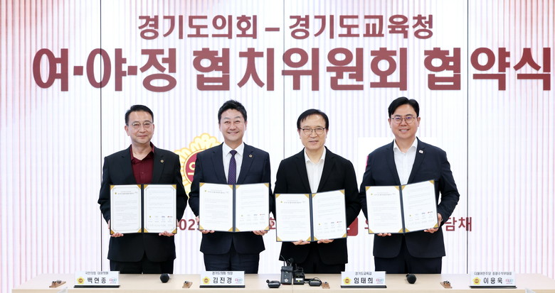 9일 도의회 김진경(더민주·시흥3) 의장과 임태희 교육감, 국민의힘 백현종(구리1) 대표의원, 더불어민주당 이용욱(파주3) 총괄수석부대표 등은 의회 예담채에서 ‘여야정협치위원회 협약식’을 열고, 경기교육의 미래를 위한 초당적 협력을 약속했다.