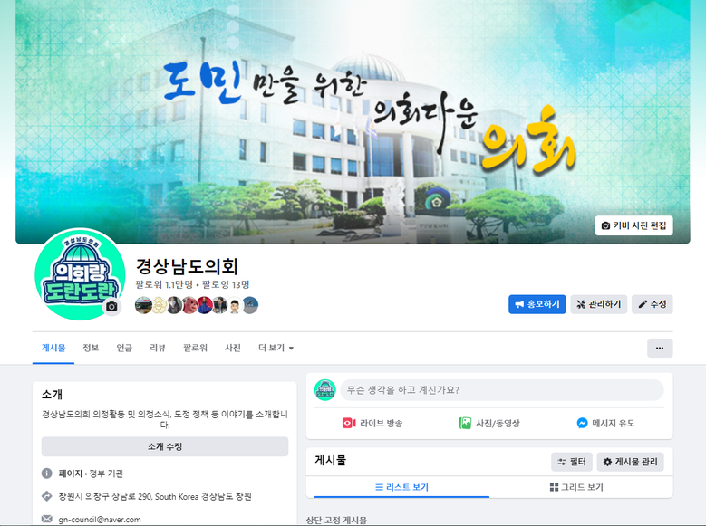붙임 : 경상남도의회가 운영 중인 페이스북 채널.