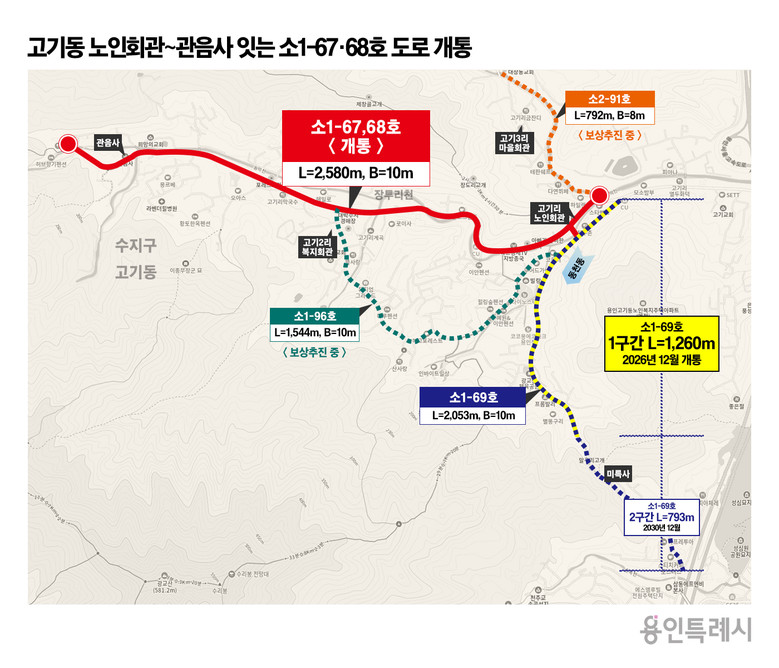 - 이상일 시장, “다음달 소1-69호선 일부 구간까지 개통되면 교통 흐름 더 좋아 질 것…고기동 지역 도로망 확충 [용인시 세계타임즈=송민수 기자] 용인특례시(시장 이상일)는 지난 11월 30일 수지구 고기동 노인회관에서 관음사까지 이어지는 도시계획도로 소1-67·68호선(연장 2.58km)을 개통했다고 1일 밝혔다.